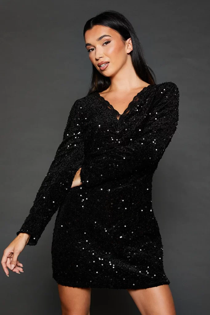 Searching for a birthday outfit that’s sparkly but also a bit different? This black sequin mini dress with the pretty floral detail on the strap is such a gorgeous idea. The square neckline feels super modern and chic, while the gathered fabric across the front adds lovely texture and shape. It’s one of those dresses that looks fabulous from every angle and gives off total party vibes.