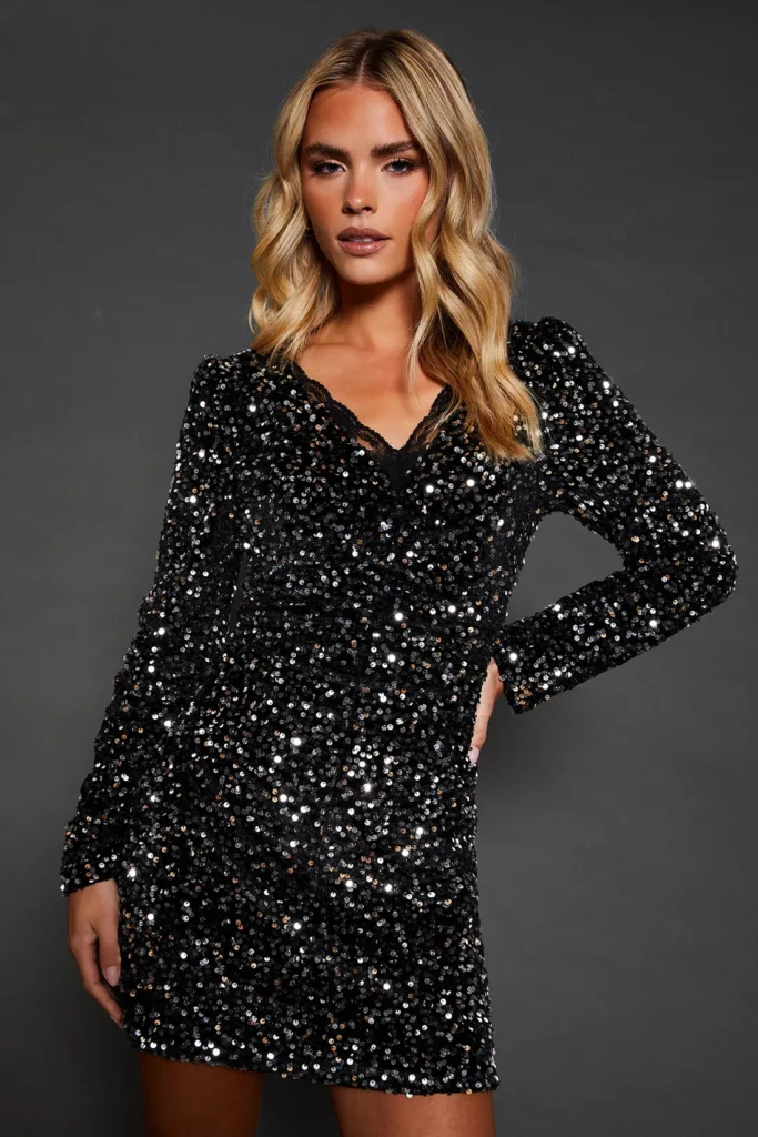 There’s something so timeless yet party-perfect about a black sequin dress, and this long sleeve mini is an absolute birthday showstopper. The V neckline and slight puff sleeves add just enough detail to make it feel elevated, while the allover sequins keep things sparkling from every angle. It’s a great idea for anyone wanting a bit more coverage while still bringing maximum glam energy to the party.