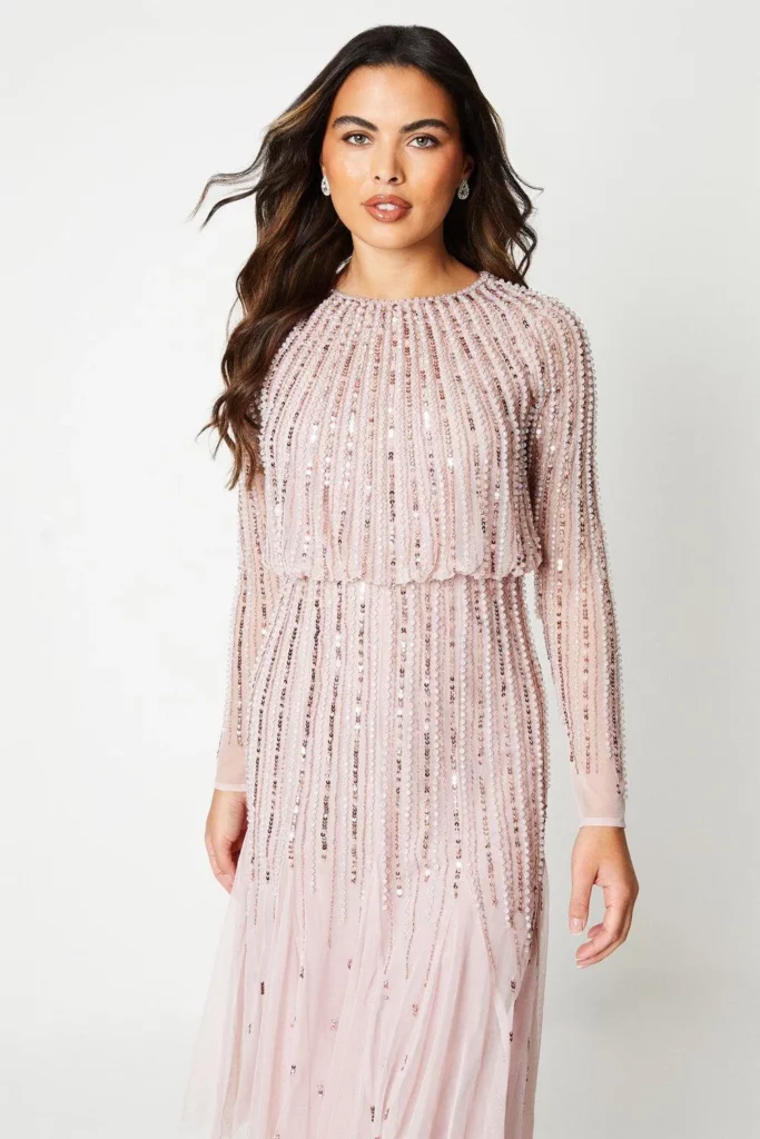 If you’re dreaming of a birthday look that’s equal parts glamorous and romantic, this blush pink sequin maxi dress is such a magical choice. The long sleeves and high neckline keep things elegant, while the vertical sequin details add amazing sparkle and elongate the silhouette beautifully. I love how it feels soft and feminine yet still totally ready for a big celebration.