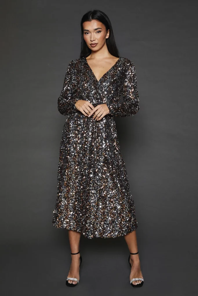 Want a little glam? If you’re all about sparkle but want a slightly more refined vibe, this black and silver sequin midi dress is such an incredible idea. The longer length gives it a chic, elegant feel, while the all over sequins keep things festive and party ready. I love how the V neckline and fitted waist add shape without being too revealing.