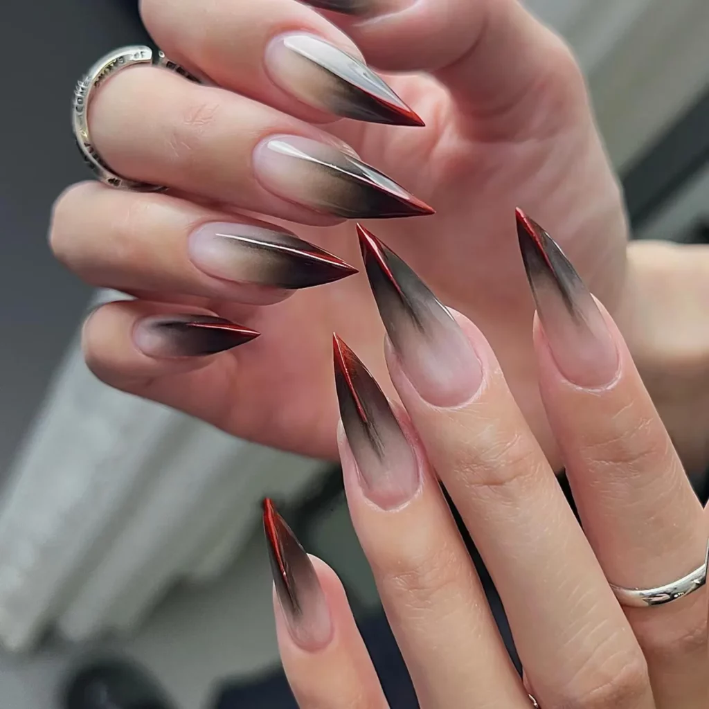 They’d be stunning for fall and winter outfits or paired with a bold lip color for extra drama. If you’re looking for nails that feel vampy yet classy, this red and black blend is definitely worth a try!