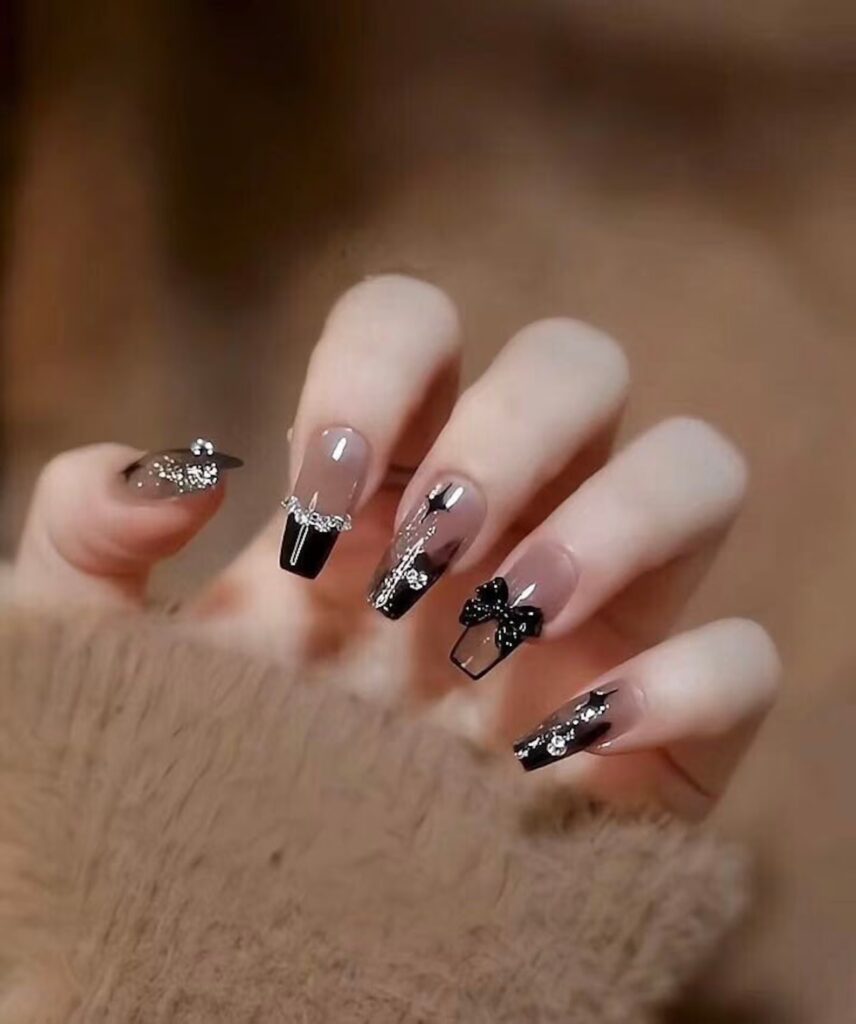These black and nude nails with 3D charms are like tiny works of art on your fingertips, and I’m obsessed with how detailed they are. The mix of glossy black tips, nude bases, and sparkling gems or bows makes them look super elegant and luxurious.
