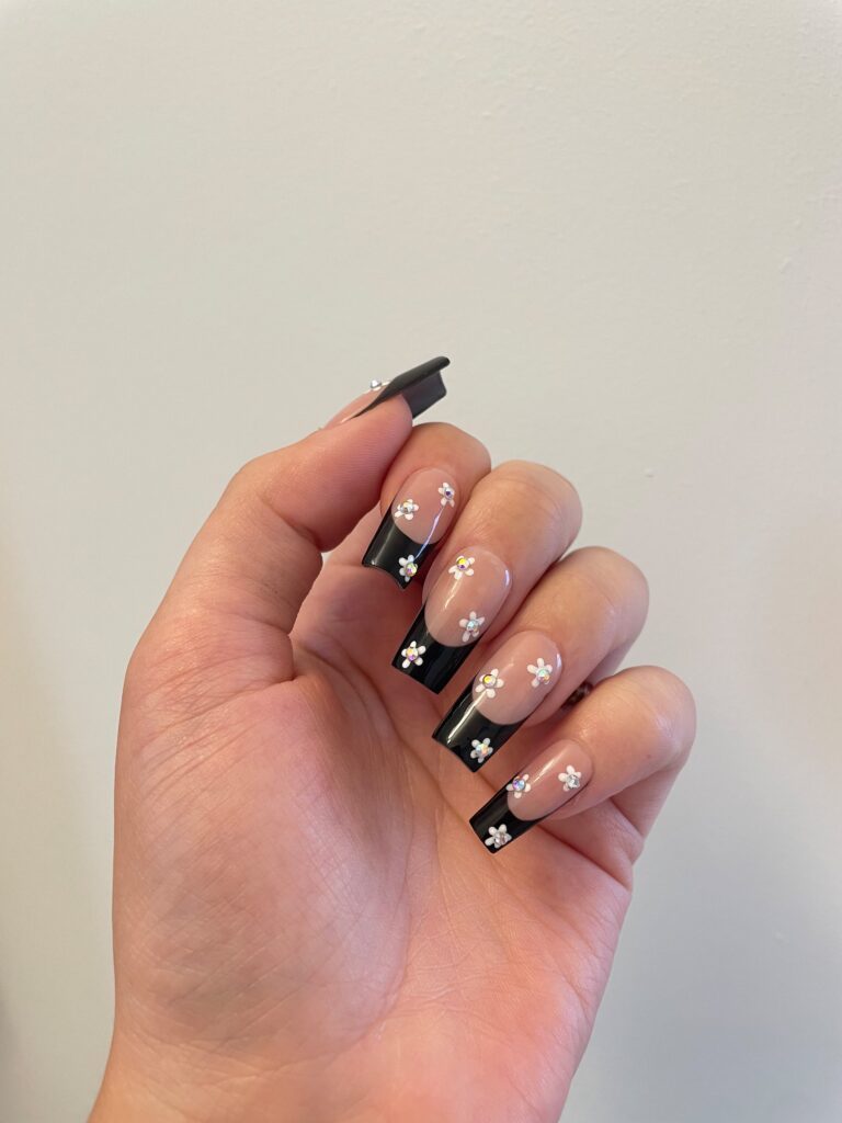 These black French tips with tiny daisy flowers are such a fun mix of edgy and cute, and I think they’re perfect for anyone who wants to keep things playful. The crisp black tips make them look sophisticated, while the delicate little daisies add a pop of sweetness.