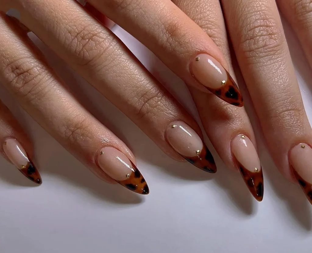 Tortoise shell tips with tiny gold studs are such a stunning idea if you’re looking for a manicure that’s classy but has a bit of wild side. The warm amber and black pattern at the tips makes a gorgeous statement while keeping the base natural and elegant.