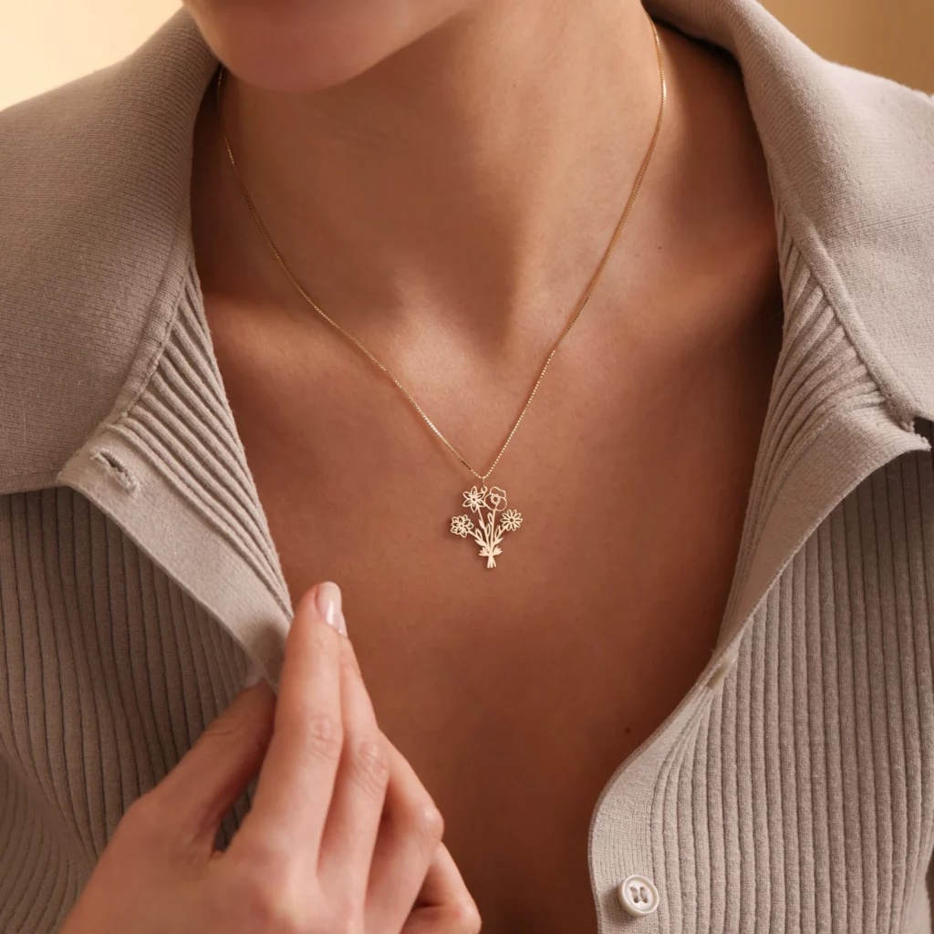 This dainty necklace features your birth flowers in an elegant, minimal design. It’s a subtle yet personal way to carry a little bit of nature and meaning with you every day.