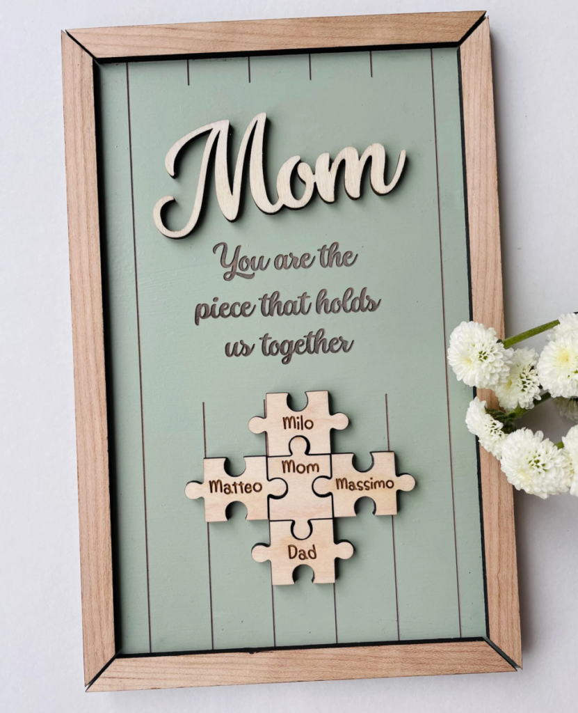 This piece is such a sweet way to remind Mom that she’s the heart of the family. You can customize each puzzle piece with names, making it a truly special and meaningful gift.