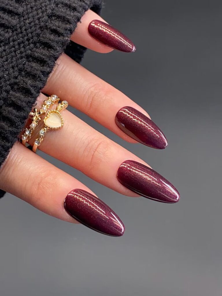 I love how these deep wine almond nails look so sleek and luxurious. The dark, glossy red is rich and intense without feeling harsh, and the almond shape gives it that classy, elegant silhouette. It’s the kind of mani that always feels stylish no matter the season.