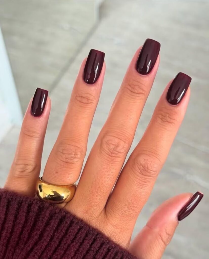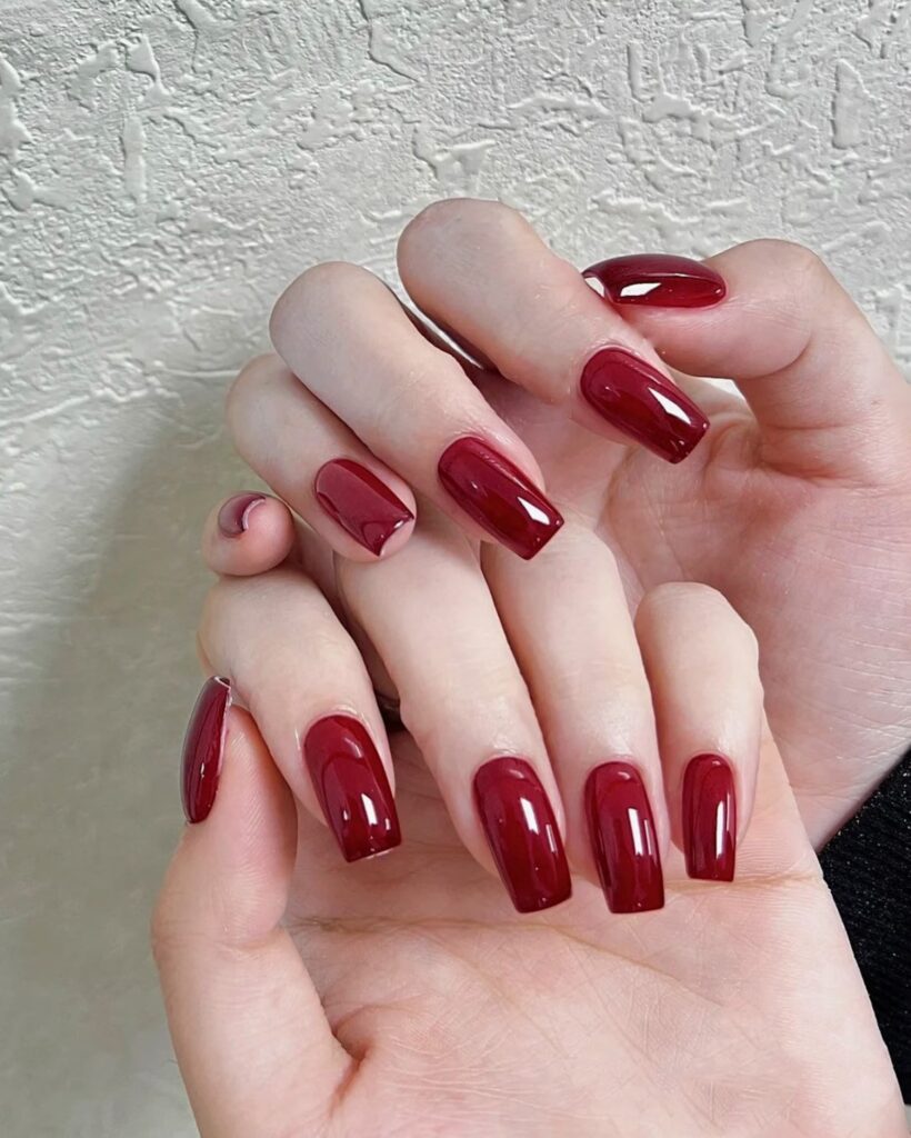Dark cherry red on square nails strikes such a beautiful balance between bold and classy. The color leans slightly toward a berry tone, giving it a richness and depth that makes it feel extra special. Meanwhile, the square shape keeps the whole look neat and modern.