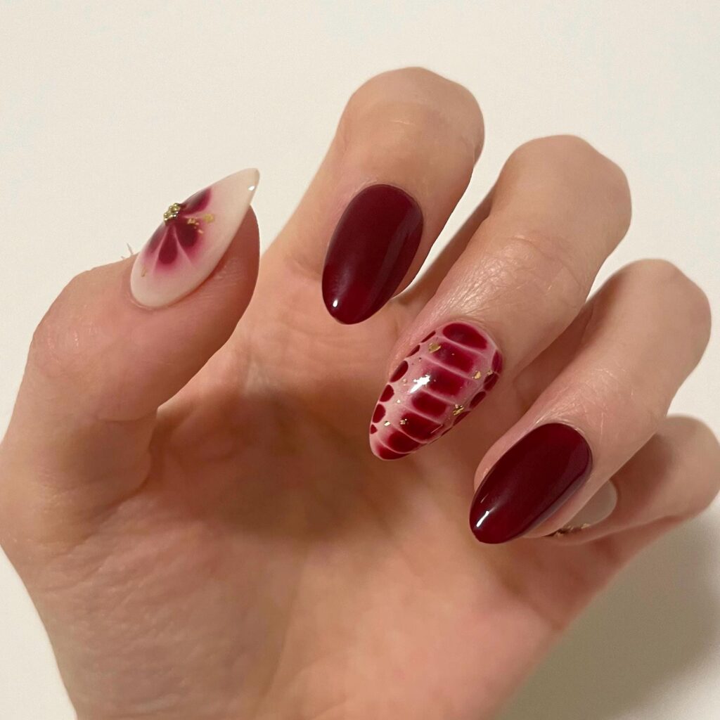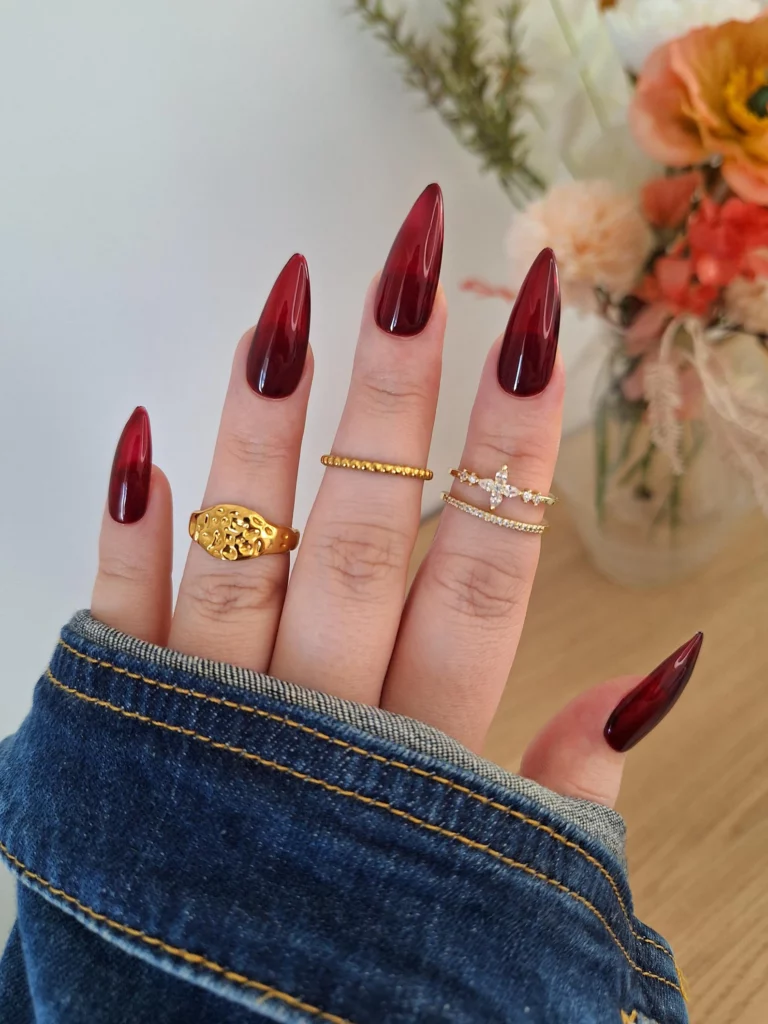 Classic wine red on almond-shaped nails always feels so timeless and sophisticated to me. The deep, rich red is bold enough to stand out, yet still subtle enough to remain elegant and classy. The almond shape elongates your fingers beautifully, giving your hands a graceful, refined look.