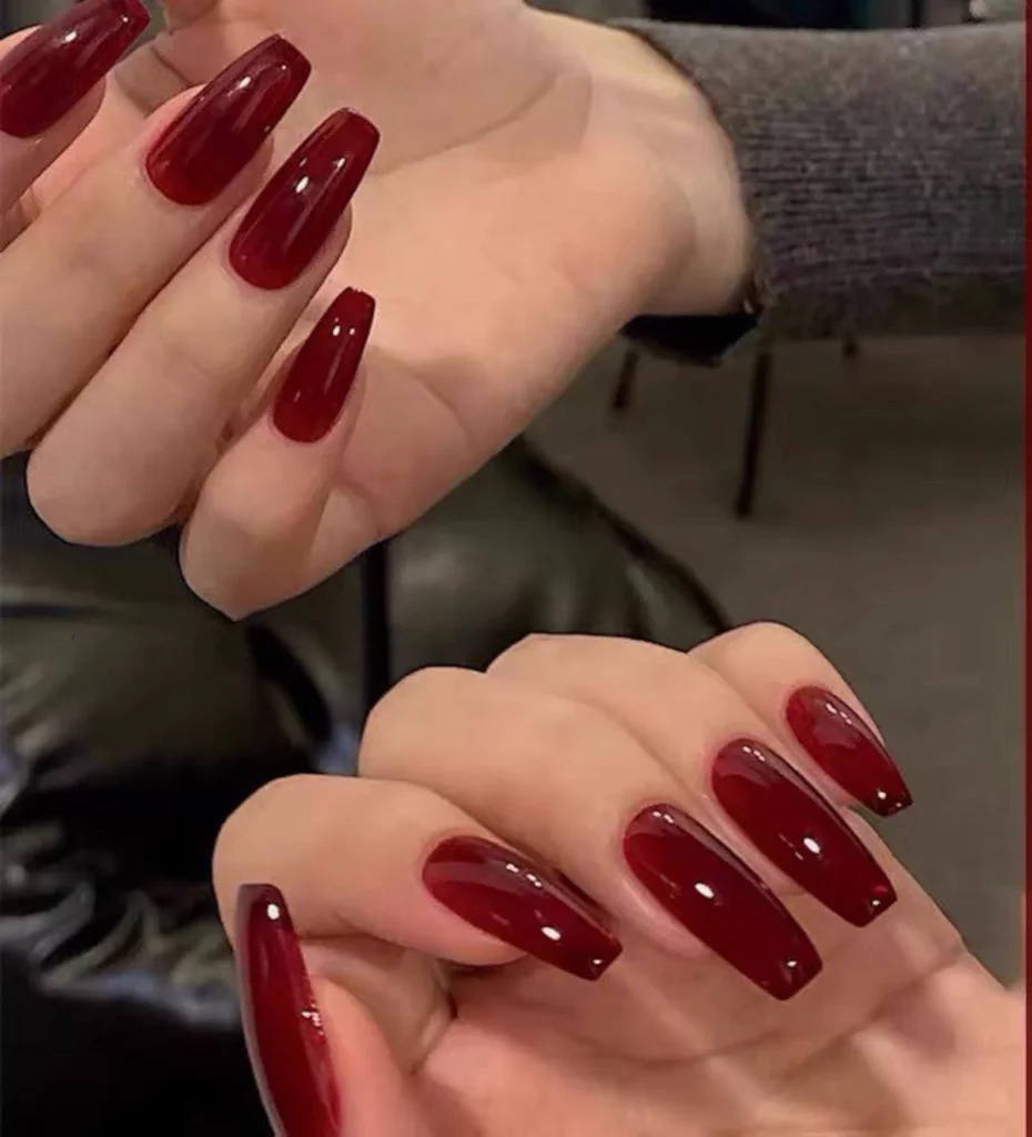 These deep red coffin nails are pure perfection if you’re into a strong, glamorous vibe. The color is so rich and intense, leaning toward a sultry wine shade that looks absolutely stunning under lights, while the coffin shape adds that modern edge that’s super trendy right now. The glossy finish gives them a sleek, polished look that’s impossible to miss and makes your nails look extra luxurious.