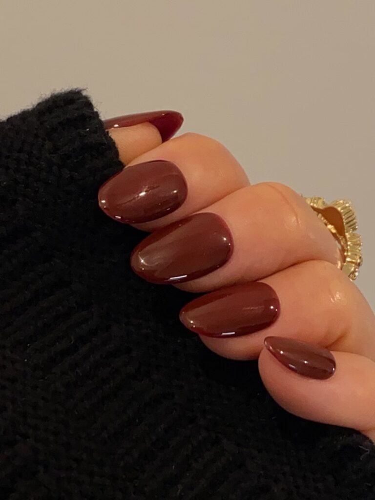 I can’t get enough of these warm cocoa-red nails because they’re such a cozy, unexpected take on classic red. The subtle brown undertones give the color a rich, earthy vibe, while the rounded shape keeps things soft and pretty. It’s a shade that feels warm and comforting, perfect for when you’re craving something a little different.