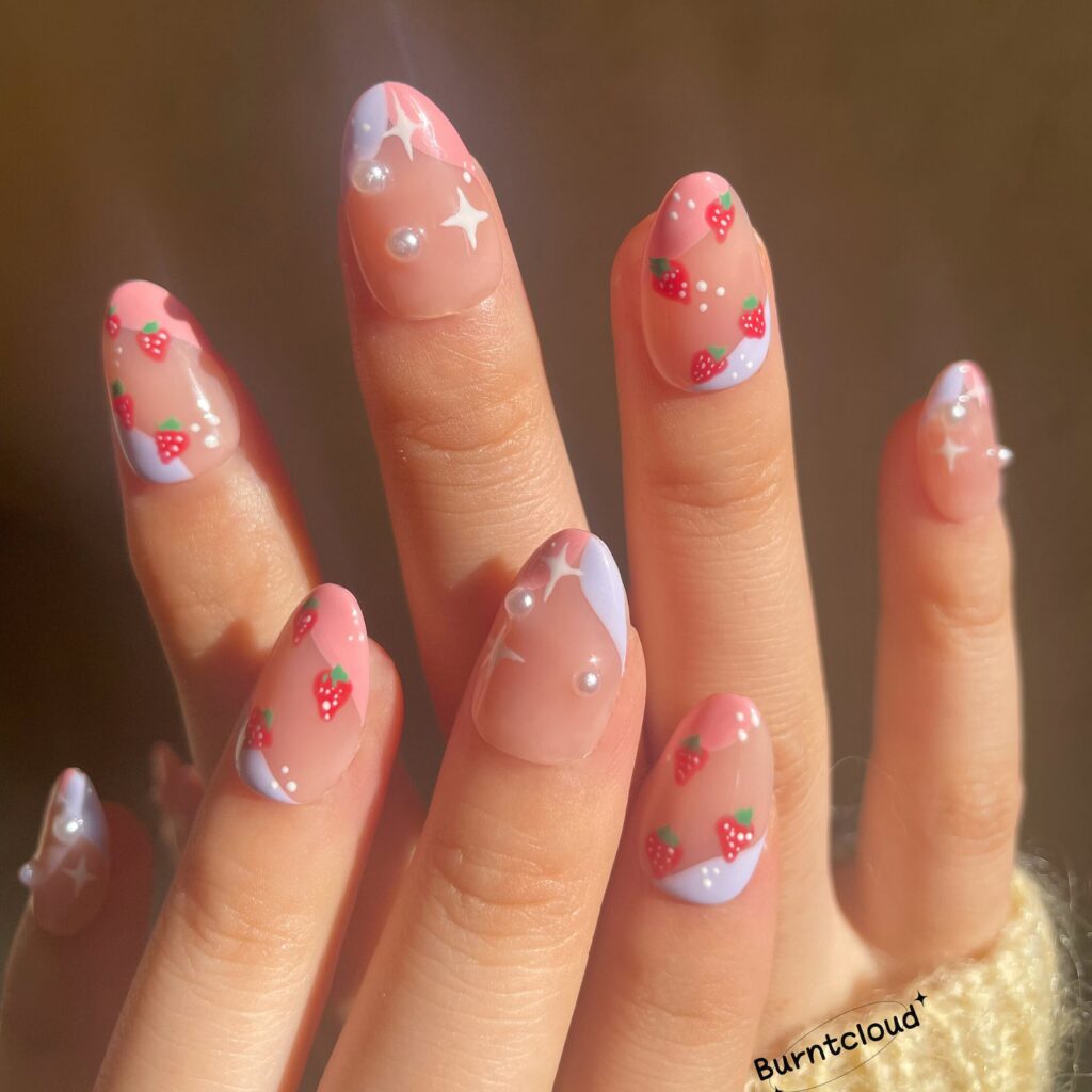 Okay, these strawberry nails are just everything. Between the sweet little berries, the glossy finish, and those adorable pearl accents, I feel like they were made for sipping strawberry lemonade in the sun. And that soft pink and lilac background? Total dreamy picnic vibes.