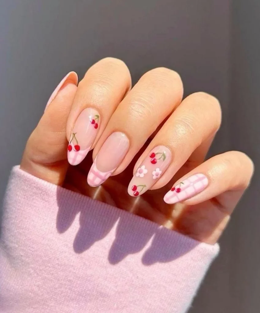 I can’t get over how cute this cherry and gingham combo is! The mix of mini red cherries, white daisies, and soft plaid tips feels like a little retro picnic moment. It’s sweet but not too much, and I love how the design still feels clean and fresh.