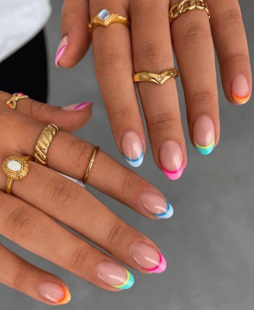 I love how these pastel French tips are both super clean and super fun at the same time. Each nail has its own pop of color—pink, orange, blue, green—and that rainbow effect just screams summer fun. It’s a great option if you want something that’s bright but not over-the-top.
