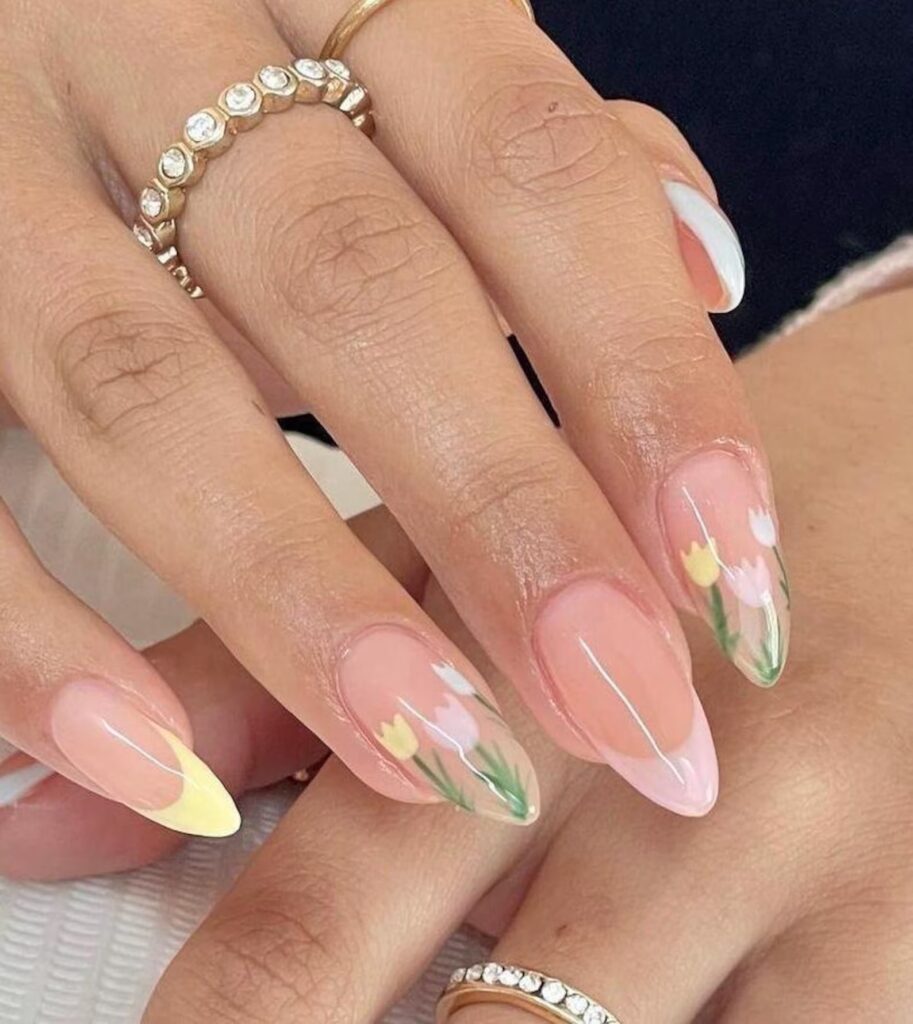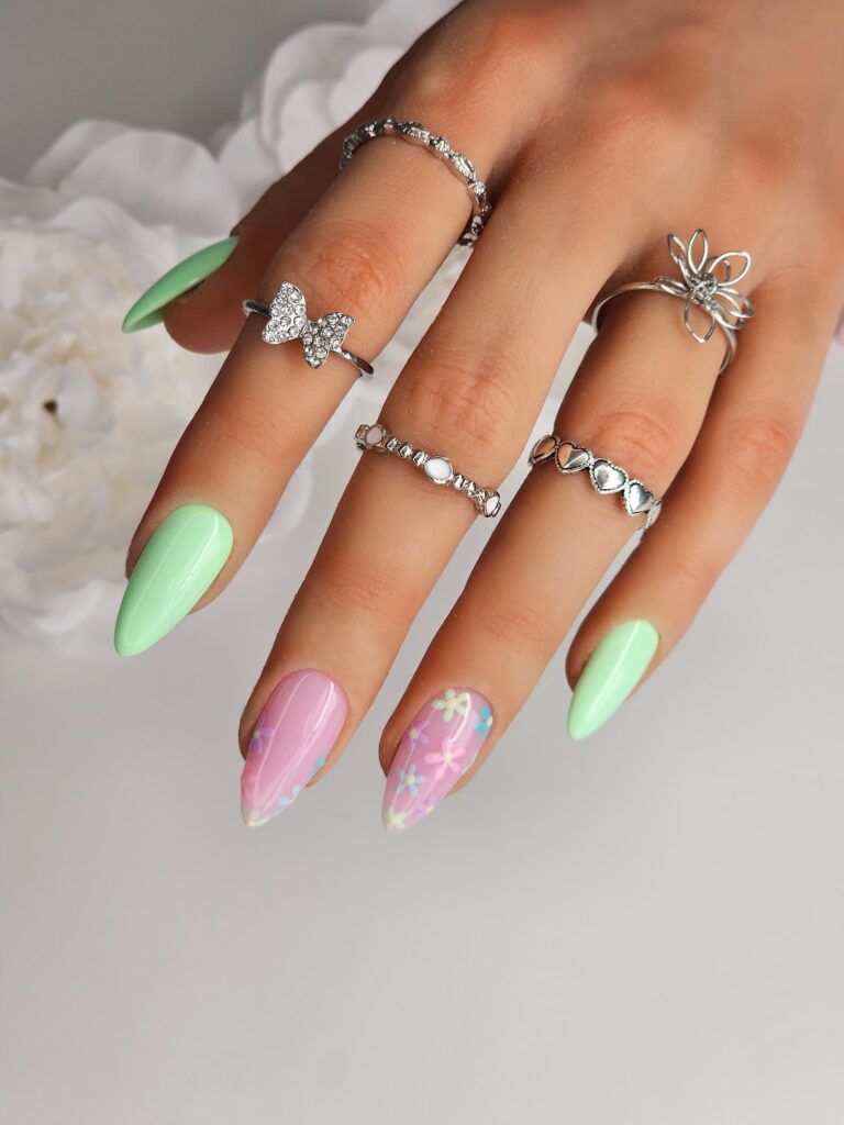 These nails are a pastel dream come true. I love the combo of mint green and soft pink, especially with those adorable multicolor floral accents on two of the nails. They’re giving me total fairy-tale vibes but in a really wearable, modern way.