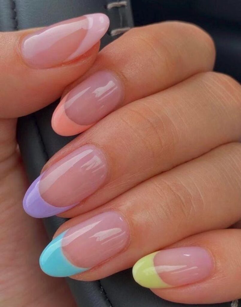 These pastel French tips feel like the definition of a soft summer day. I love the combo of lilac, coral, mint, blue, and lemon yellow against that glossy nude base. It’s giving “cloud-gazing in the park” kind of vibes—simple, but so cheerful.