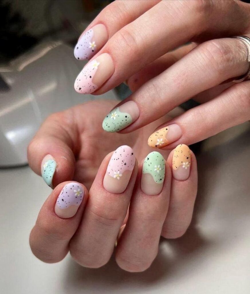 I am absolutely in love with this speckled pastel look. The matte finish, the soft greens, purples, and oranges, the teeny daisy details…it’s all so charming and different. It feels like Easter eggs mixed with wildflowers, and I’m all about it.