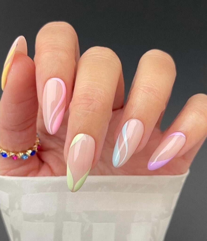 There’s something so fun about these wavy designs…like a little swirl of sorbet on your nails. The pastel pink, mint, blue, and purple waves give this set a retro ’70s flair with a modern twist. It’s a total mood for days when you want to be playful but still keep it low-key.