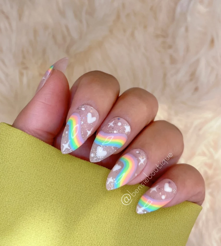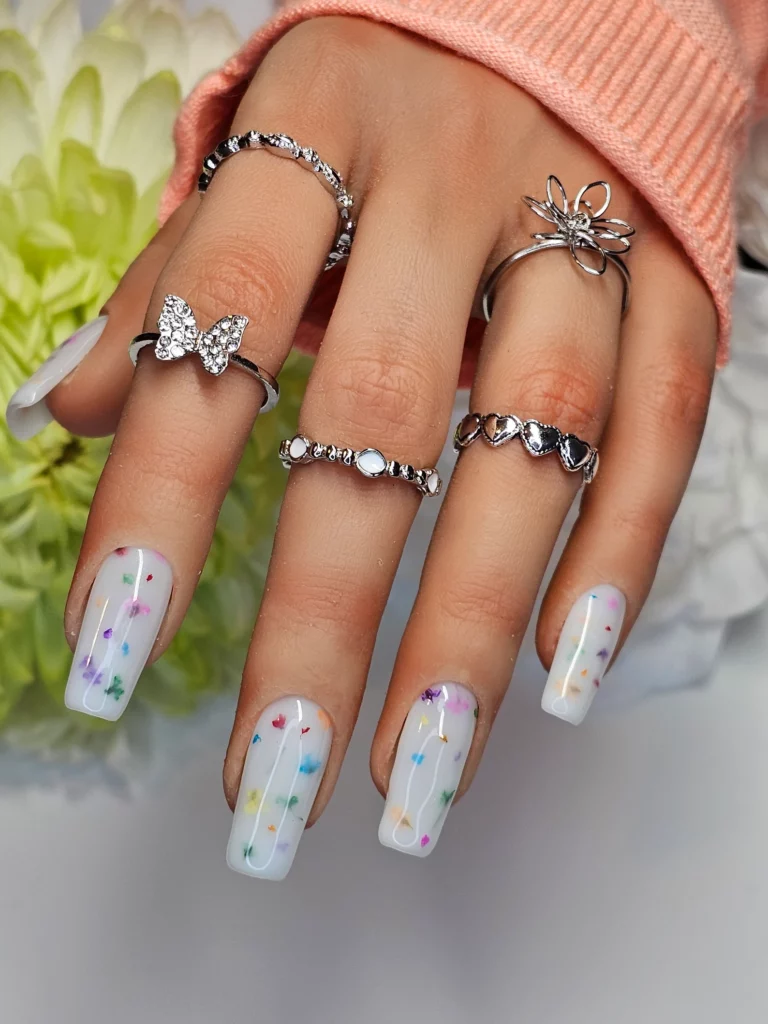Okay, how dreamy are these?! I love how the soft white base gives the tiniest pop of rainbow confetti without being too loud. It feels like little wildflowers or party sprinkles frozen in time. It’s giving that clean-girl vibe with a playful twist, which I’m always here for.