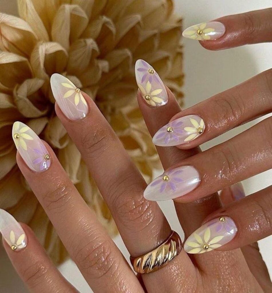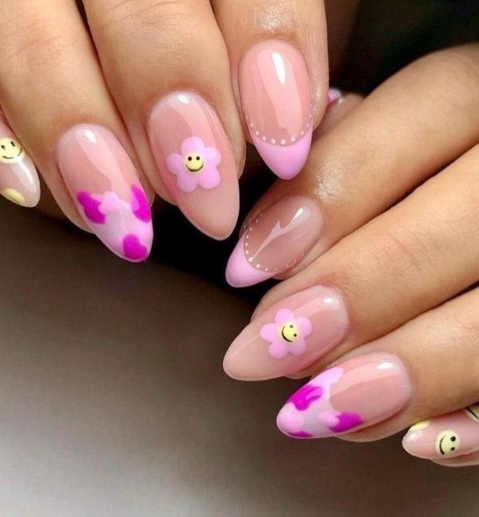 Tell me these little daisy face flowers aren’t the cutest things ever! The mix of playful pink tones, happy blooms, and tiny dotted accents feels like sunshine bottled up into a manicure. It’s the kind of set that just instantly lifts your mood.