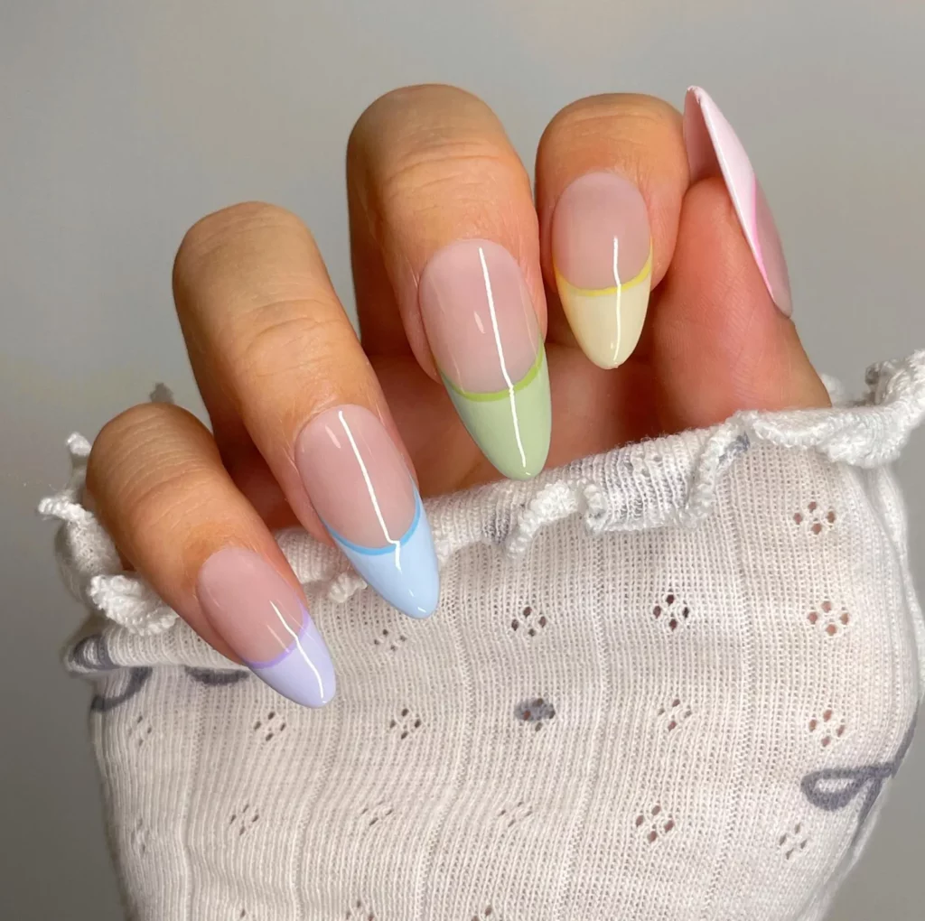 There’s something about a pastel French mani that feels so fresh for summer. The soft colors—mint green, sky blue, baby yellow, and lavender—are so subtle but still stand out in the cutest way. It’s clean, simple, and still totally fun.