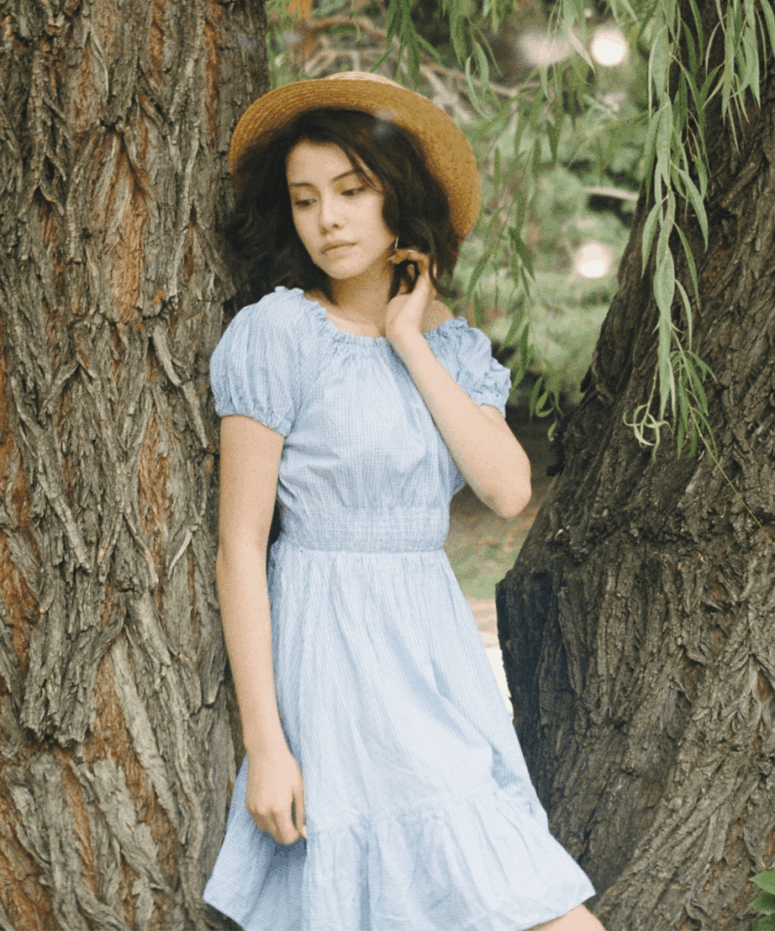 There’s something so effortlessly sweet about a soft blue gingham dress, especially when it’s paired with a straw hat and a dreamy picnic setting. The puff sleeves and ruched neckline give it that gentle vintage vibe, perfect for lounging under the trees with a basket of fresh fruit and lemonade.