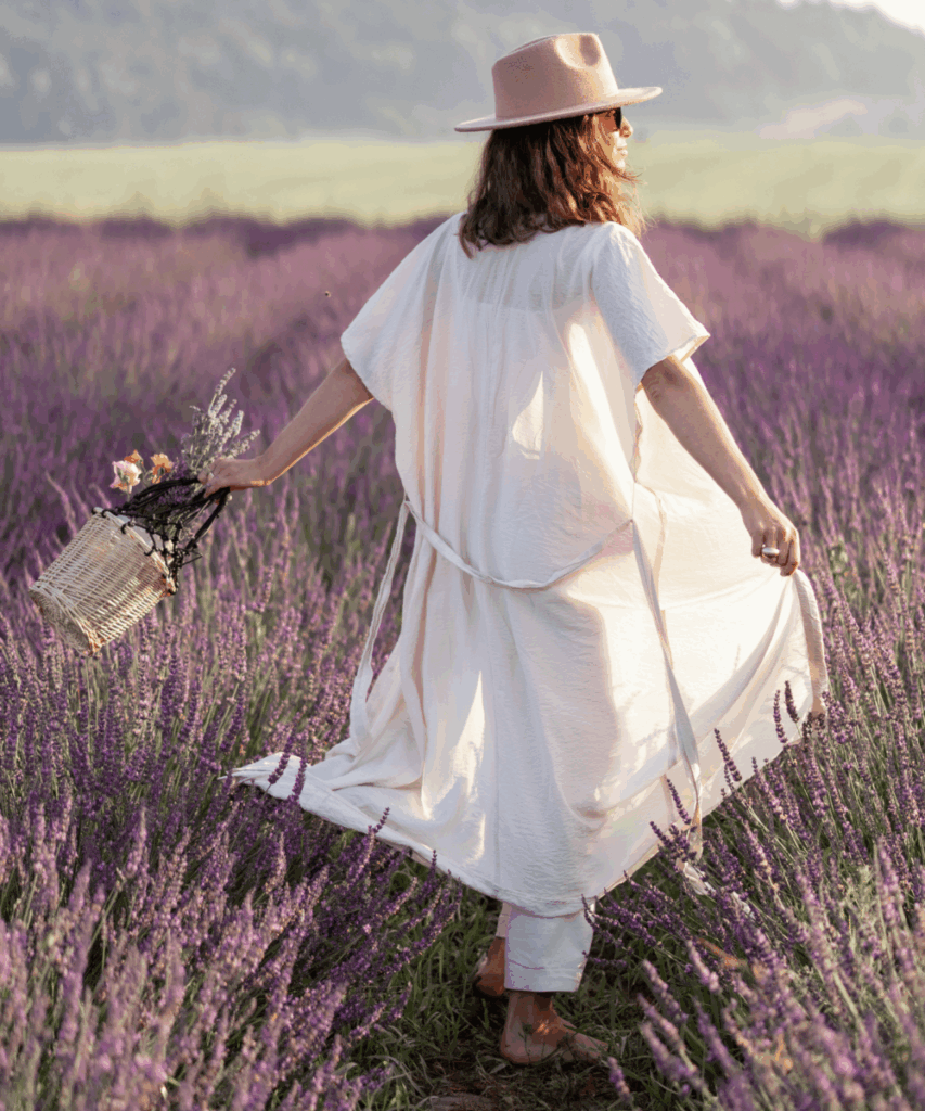 I’m obsessed with how peaceful and graceful this whole look feels, barefoot in the lavender fields, soaking up golden hour, with a basket full of blooms in hand. It’s the definition of summer magic.