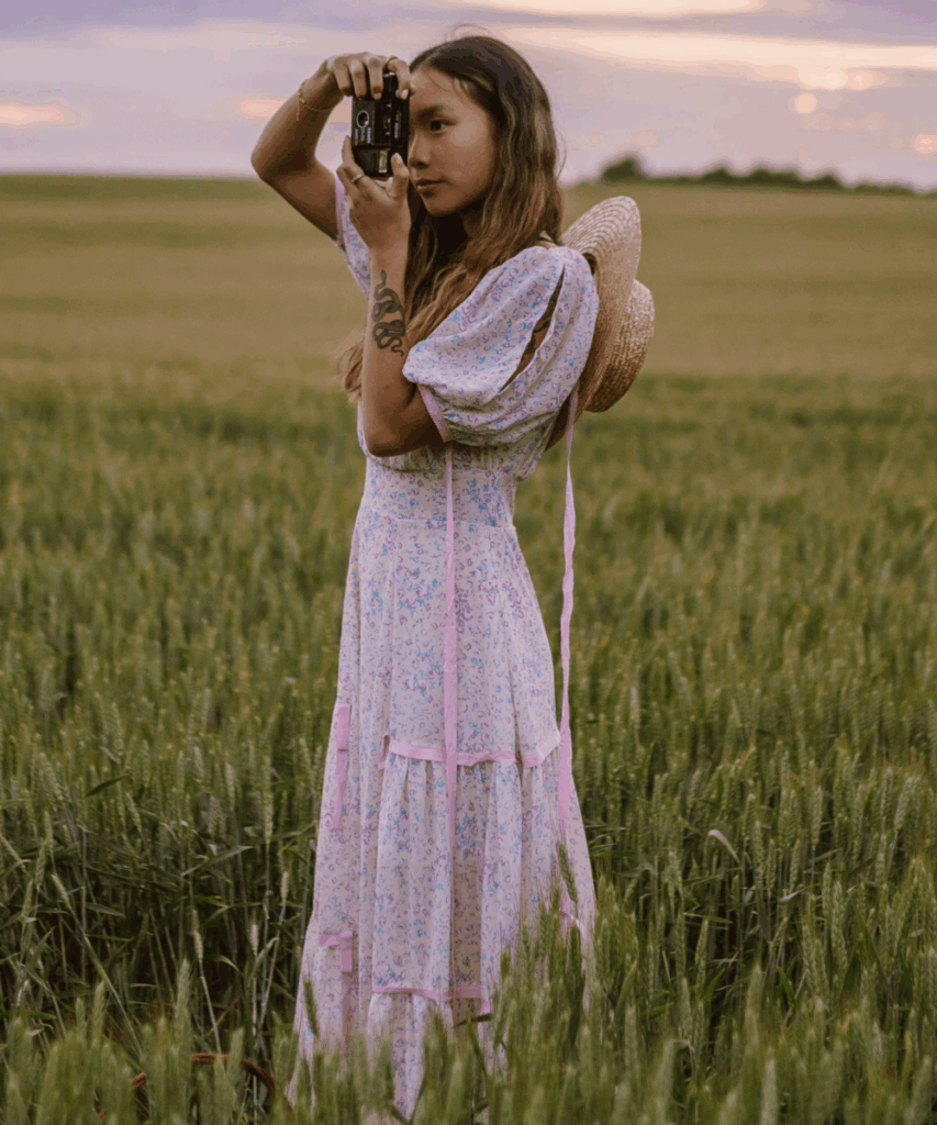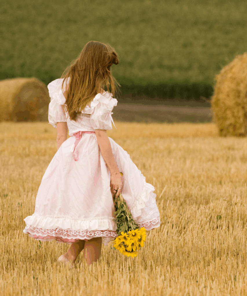 This pink and white puff sleeve dress is pure fairytale magic. The ribbon detailing, lace trim, and full skirt create such a playful, princess-like vibe that’s perfect for a dreamy picnic surrounded by sunflowers and hay bales.