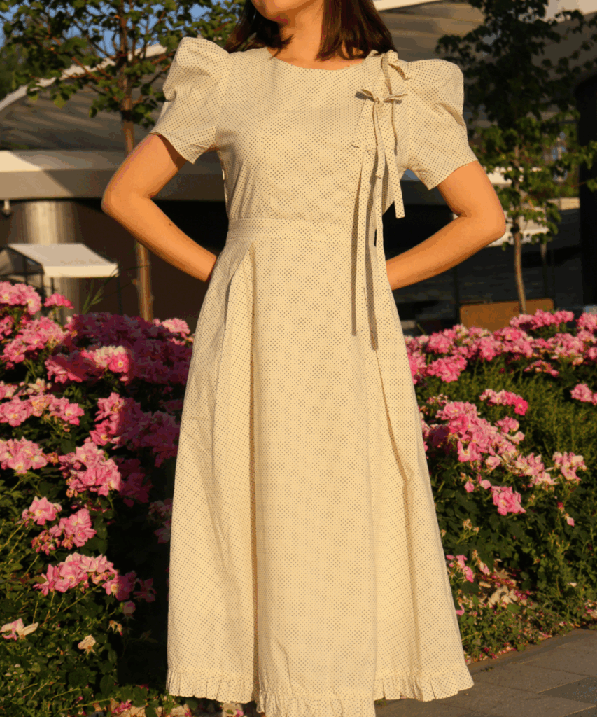 This cream dress with subtle polka dots and puff sleeves is giving timeless elegance with just the right amount of girly charm. It’s sweet, structured, and perfect for a sunny day out surrounded by blooming flowers and good company.