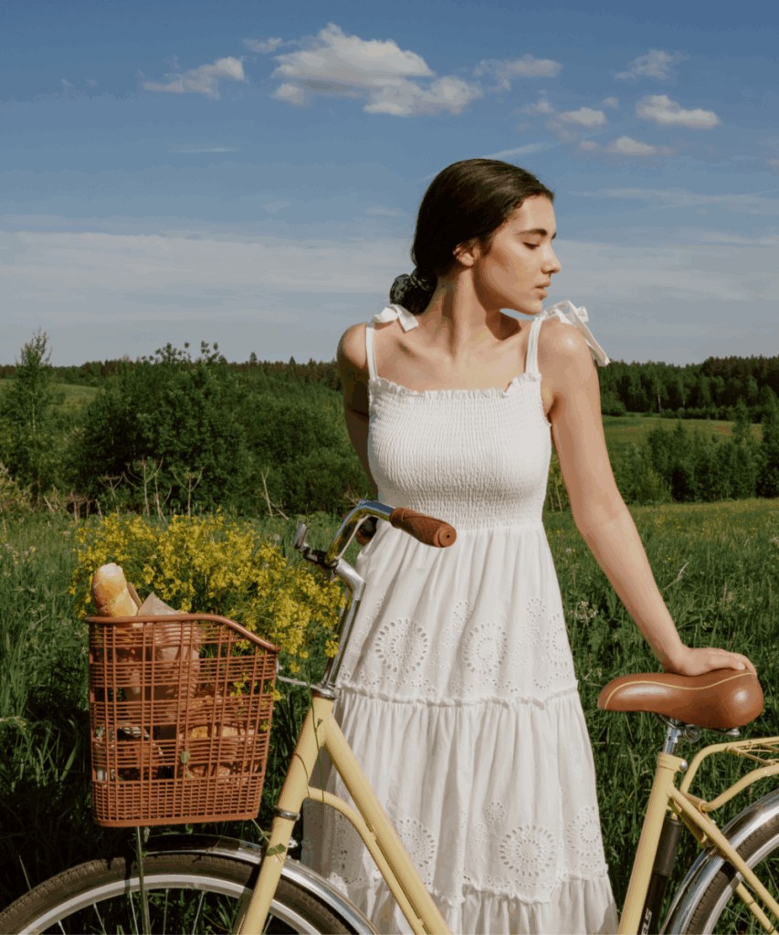 I love how the whole look says laid-back summer afternoon without trying too hard. It’s ideal for lounging on a picnic blanket with flowers nearby, a book in hand, and the breeze playing with your hair.