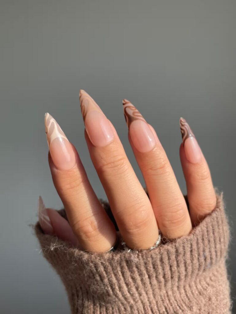 Neutral nails get a whole new vibe when you add soft brown swirls to the tips. The pattern feels light, airy, and artistic, while still staying grounded in warm autumn tones. It’s an elegant way to add some fun to a minimalist look.